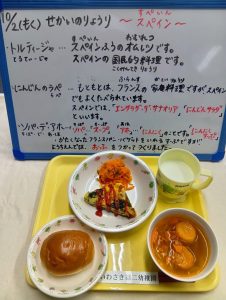 「いわさき第二幼稚園」の本日の給食は、世界の料理〜スペイン🇪🇸〜でした。スペイン🇪🇸の「トルティージャ」(スペイン風オムレ))、「にんじんのラペ」(にんじんのサラダ)、ソパ・デ・アホ(にんにくのスープ)を堪能しました。