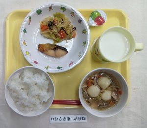 「いわさき第二幼稚園」の今日の給食は、お月見にちなんだ献立です。今日は、一年のうちで最も月がきれいに見える「十五夜」です。昔から十五夜には、お月見だんごやすすきを窓辺に飾り、お月見をする風習があります。「お月見だんご汁」は、白玉粉と上新粉を6対4の割合で使用し、木綿豆腐と絹豆腐を加えて混ぜ合わせ、一つずつ丸めて茹でただんごと、野菜や鶏肉が入った汁を合わせました。あいにくの曇り空ですが、夜にはきれいなお月様が見えるといいですね!