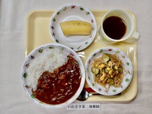 「いわさき第二幼稚園」は、運動会の代休でお休みで、給食は預かり保育「にじ組」のものです。