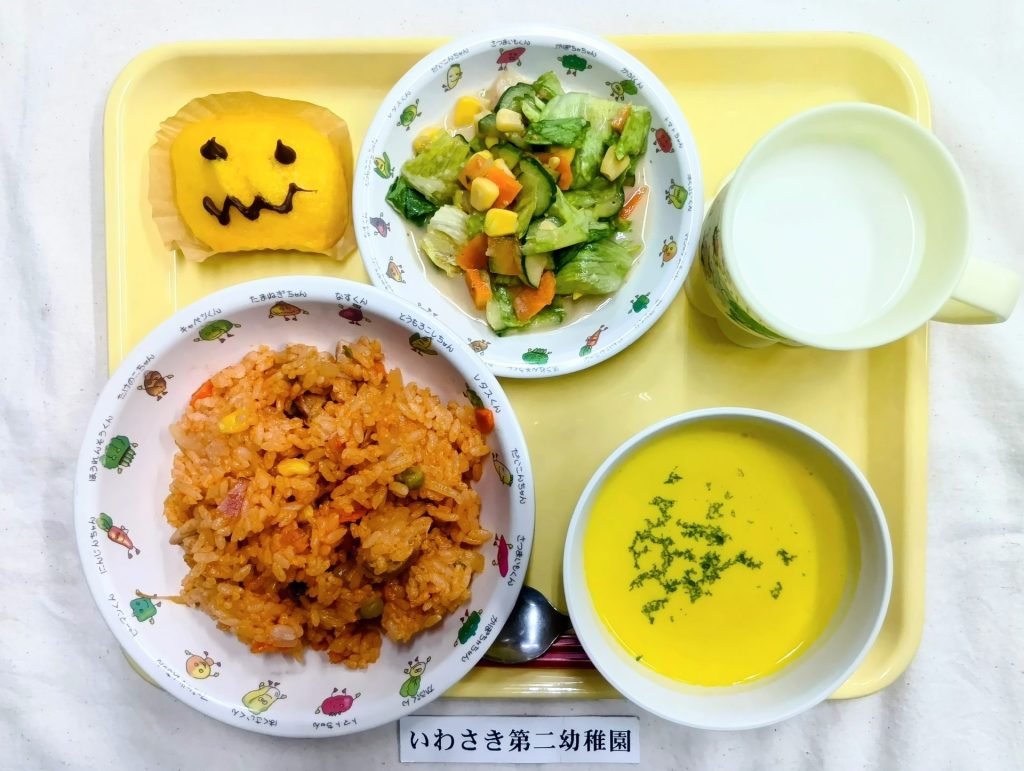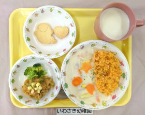 「いわさき幼稚園」の給食は、キャロットライスシチュー/かぼちゃのサラダ/ゆでブロッコリー/手作りクッキーです。朝から「今日はどんなクッキーかな?」と楽しみに待っていてくれました。おばけの形のクッキーが登場すると、「かわいい!」と大喜び。ハロウィンの雰囲気を感じながら、笑顔いっぱいの給食の時間となりました。