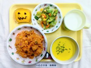 両園とも“ハロウィン集会”がありました。給食もハロウィンにちなんだ特別食となりました。