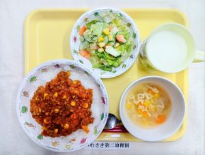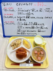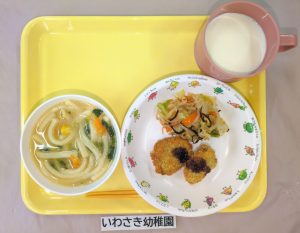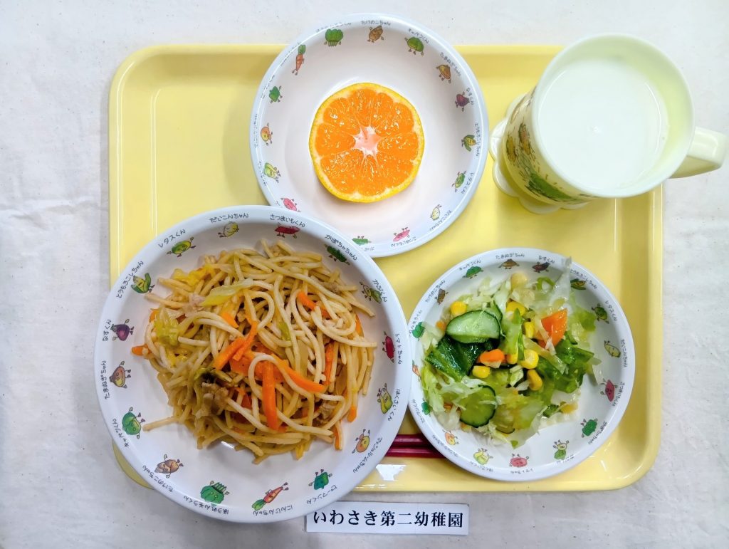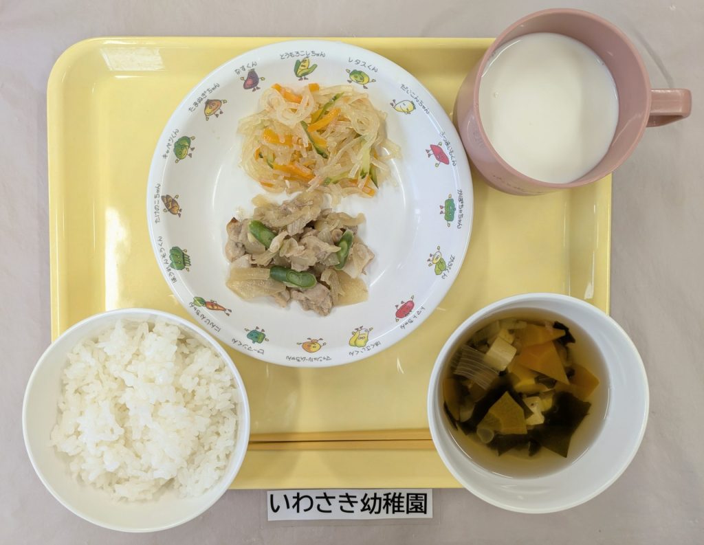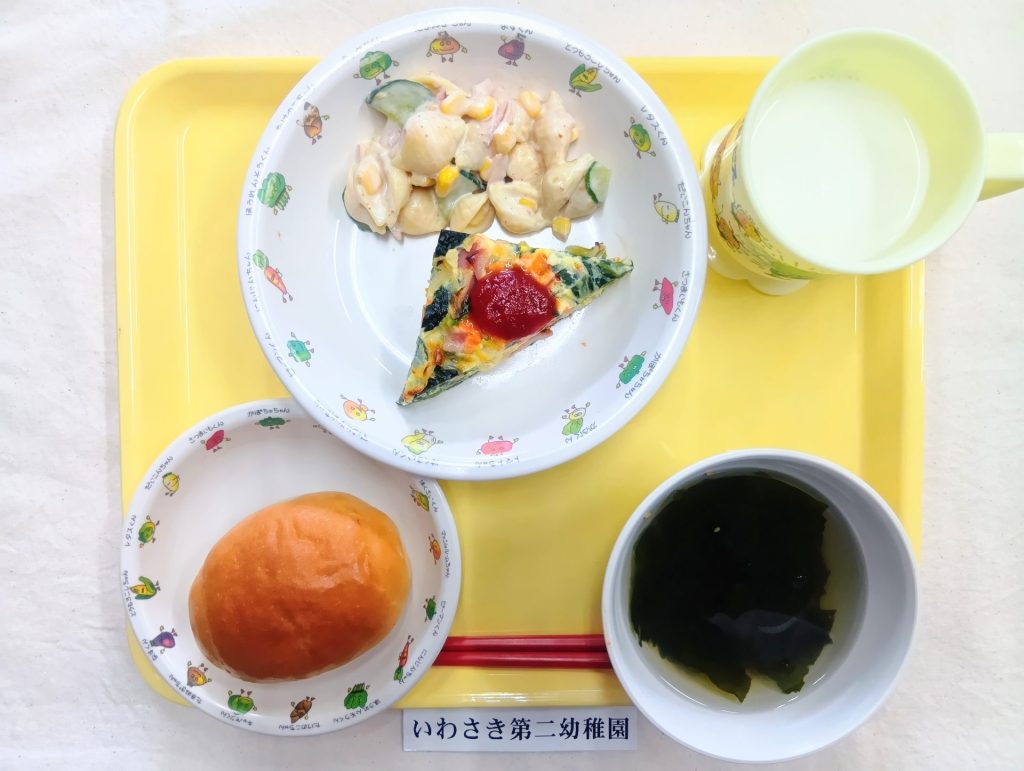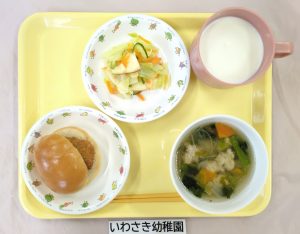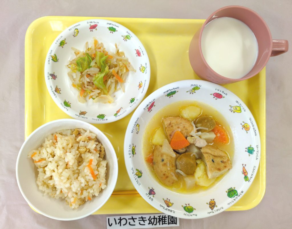 「いわさき幼稚園」の給食は、キャロットライスシチュー/かぼちゃのサラダ/ゆでブロッコリー/手作りクッキーです。朝から「今日はどんなクッキーかな?」と楽しみに待っていてくれました。おばけの形のクッキーが登場すると、「かわいい!」と大喜び。ハロウィンの雰囲気を感じながら、笑顔いっぱいの給食の時間となりました。