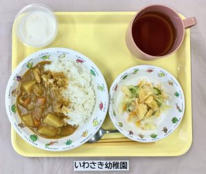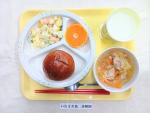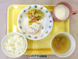 「いわさき幼稚園」は本日は短縮保育で、給食は「にじ組」のものになります。