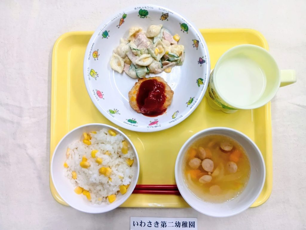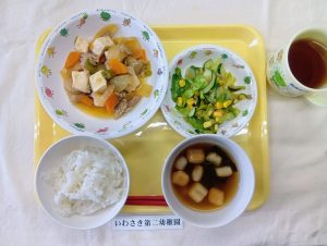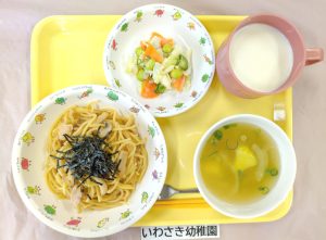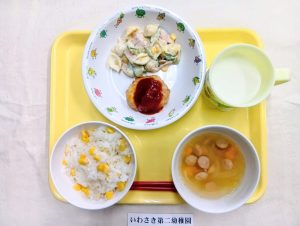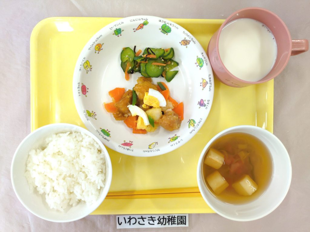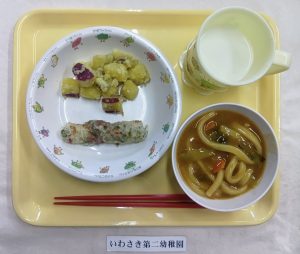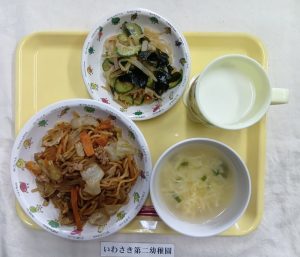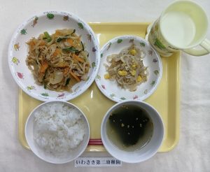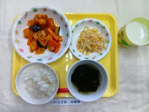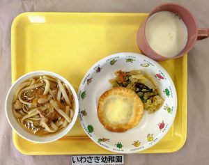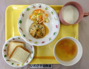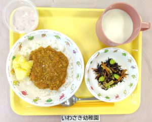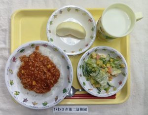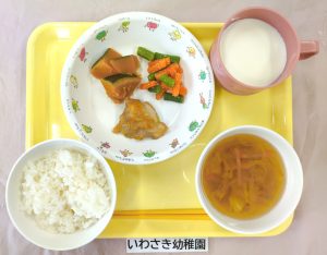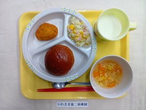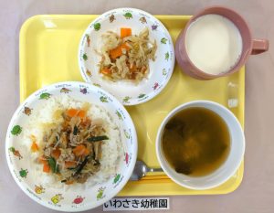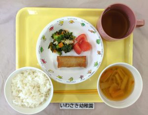 「いわさき幼稚園」は本日は開園記念日でお休みで、給食は預かり保育「にじ組」の給食となりました。