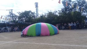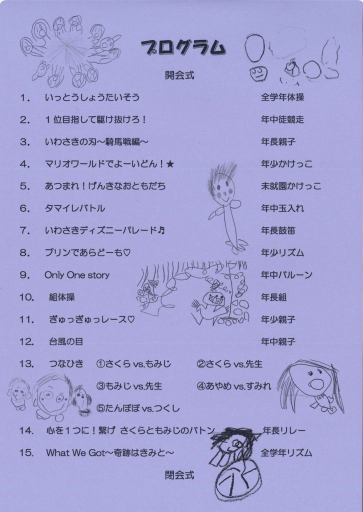 10月18日(土)に「いわさき第二幼稚園」の運動会が園庭で開催されました。涼しい快晴の気候となり、絶好の運動会日和でした。今年は、こどもたちが入退場するときに通る“入退場門”を全学年のおともだちが「造形指導」の先生のご協力のもと、共同で作り上げました。また、組体操も一部の技に“こどもたちの発想”を取り入れたものとしました。実際の競技では、年少さんが熱心に取り組む姿はとてもかわいいものがありました。また、年中、年長さんが集中して真剣な表情で取り組む姿には、とても頼もしいものがあり、昨年からの成長を感じ取ることができました。未就園児のお友達も多数参加したり、また、親子競技では多数のお父さんたちの活躍も見られ、盛況な運動会となりました。保護者の方の暖かいご声援のもと、子どもたちもは楽しく競技に取り組むことができたと思います。当日の保護者の方のさまざまなご協力にあらためて感謝申し上げます。